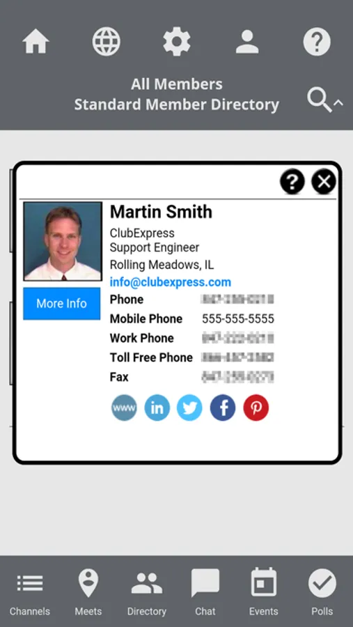 This application provides access to the membership directory, chat feature, member calendar events, polls and surveys, membership card, and website content.