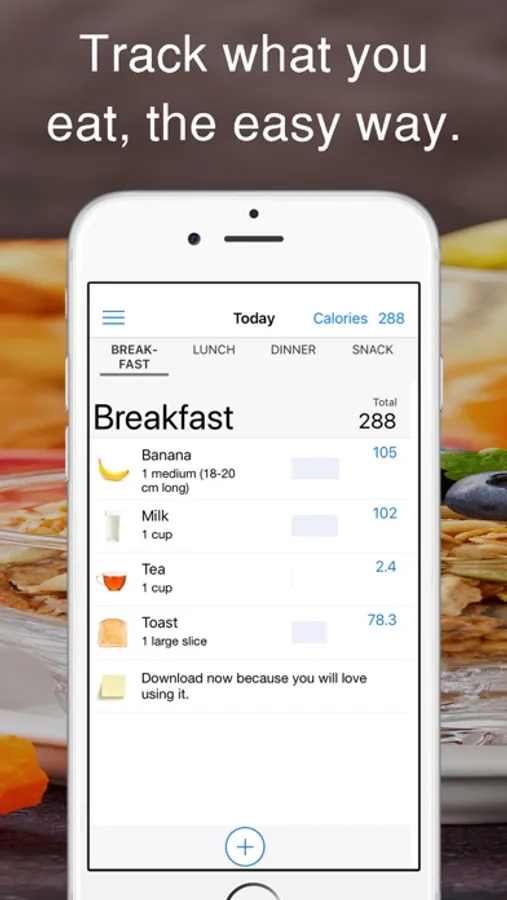 1. A simple and powerful design: The app opens directly on the entry screen, on the most recent meal, because that is what you'll use most. The design makes adding entries as simple and intuitive as possible.