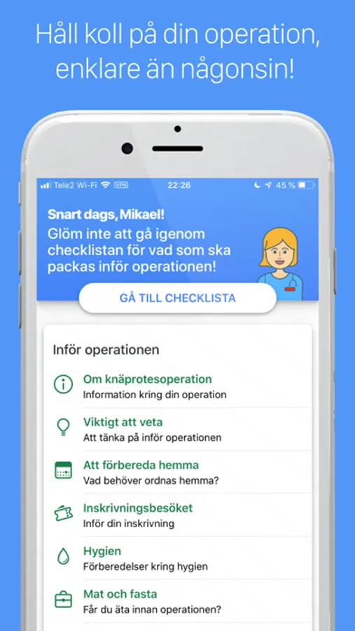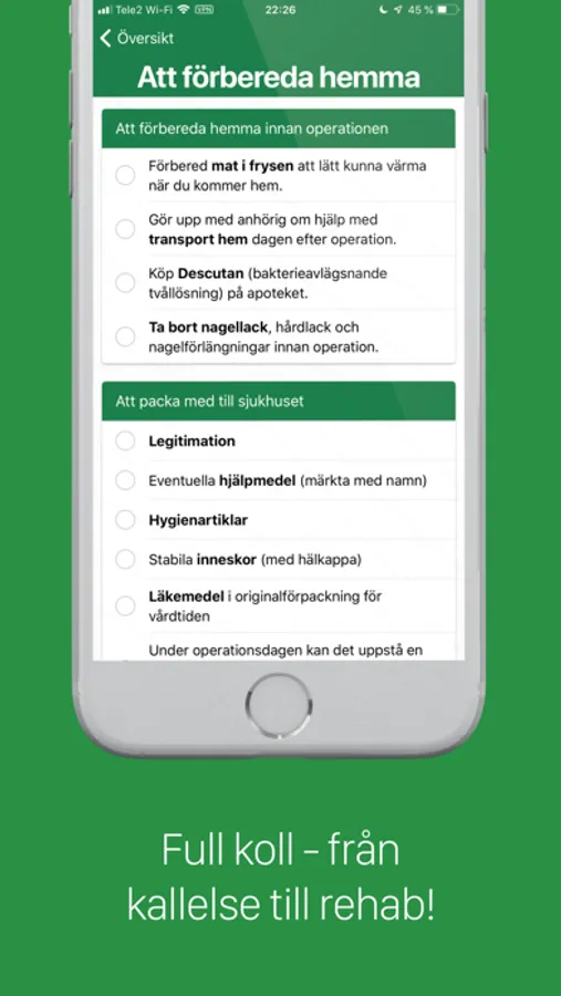 Operationskollen är appen som hjälper dig vara delaktig i din egen vård. Hur var det med fasta? Vilka läkemedel får jag? Hur var den där träningsövningen igen?