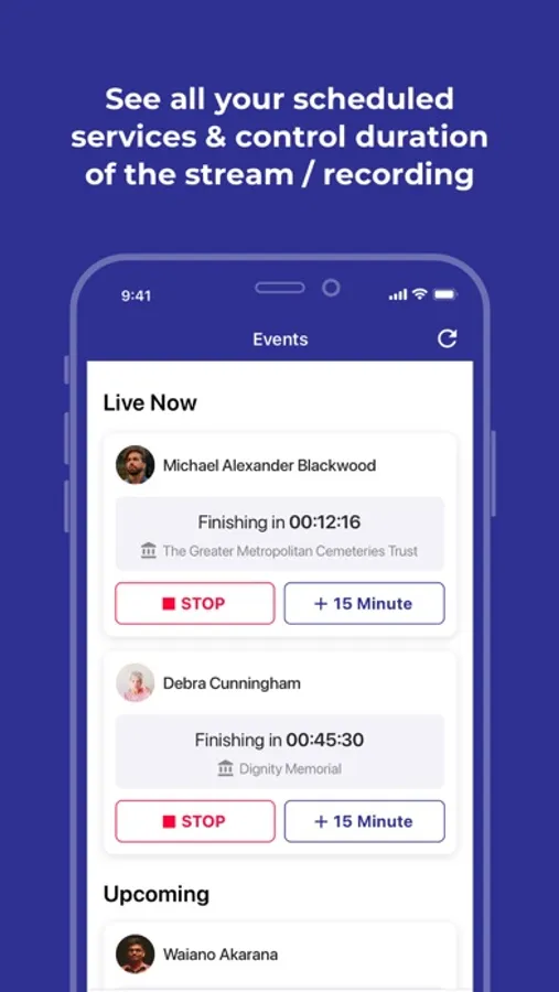 During the live stream, a thumbnail view of the livestream will be available to monitor progress. If you choose to extend the stream/recording,15 minutes will be added to the scheduled time. This can be done more than once to add a further 15 minutes to the livestream. If you choose to stop the service it will also give you a prompt to confirm you want to do this.