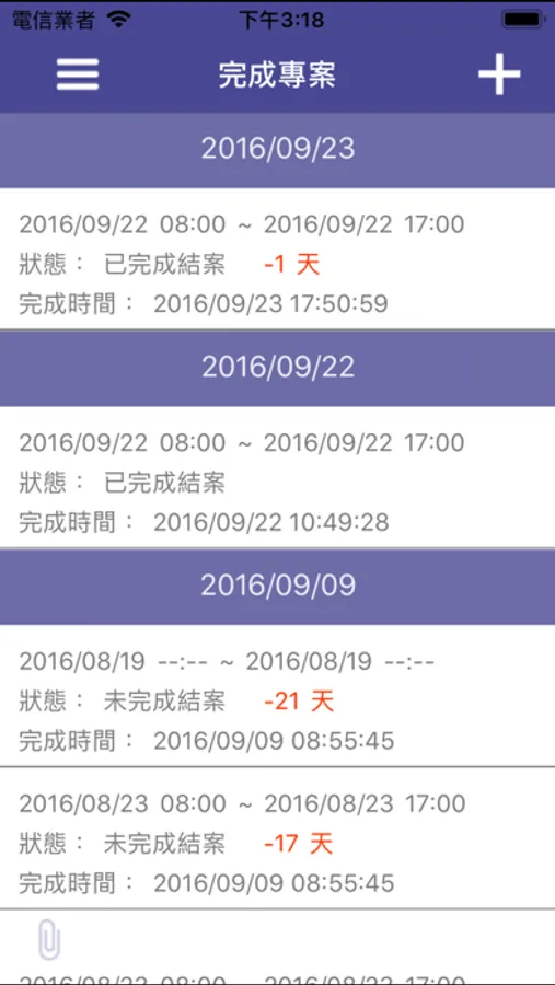 完成專案:按結案時間查看已完成的專案狀態。