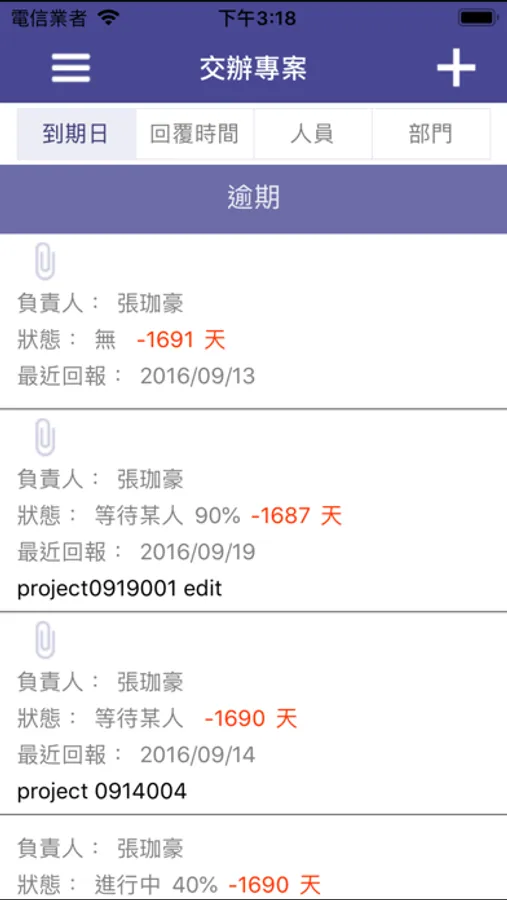 負責專案:查看負責的今日、逾期及未來專案。
