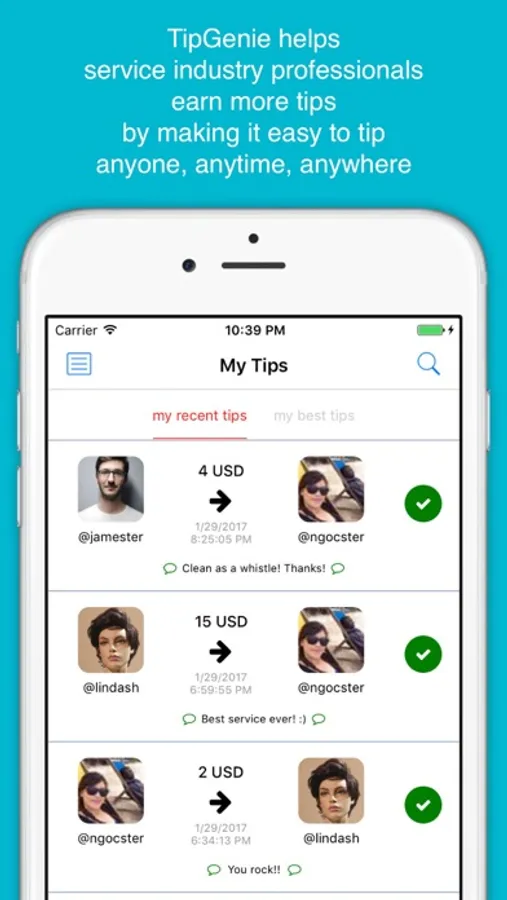 TipGenie is a mobile payment app that helps service industry professionals earn more tips and gratuity by making it easy to tip anyone, anywhere, anytime without cash.