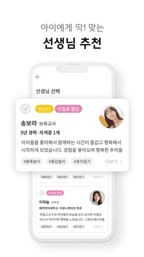 - 특기교사 : 실 육아 경험이 있으시거나 아동 관련 놀이 자격 또는 경력을 다양하게 보유하신 선생님이에요!