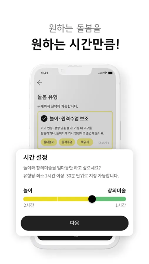 원하는 돌봄과 수업을 선택하여 원하는 날짜에 필요한 시간만큼 선택하세요.