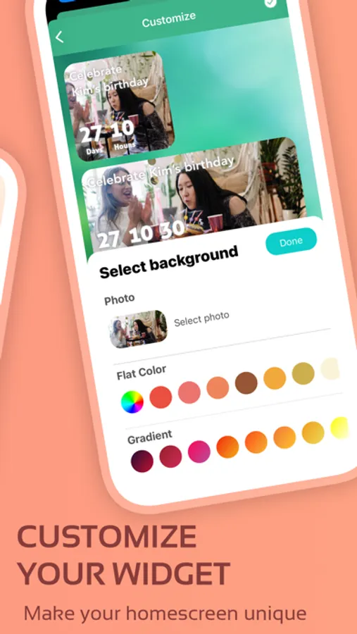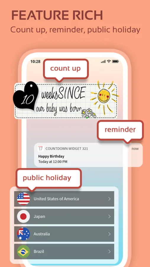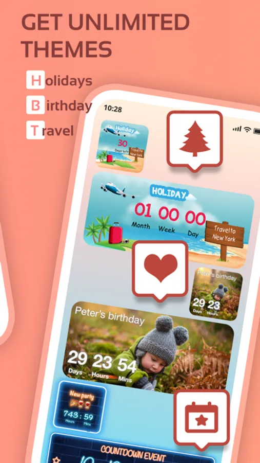 + VARIOUS WIDGET STYLES: Birthday, retirement, a baby born, wedding…Those are not mere images like other widget apps, but are uniquely designed to fit for your events.