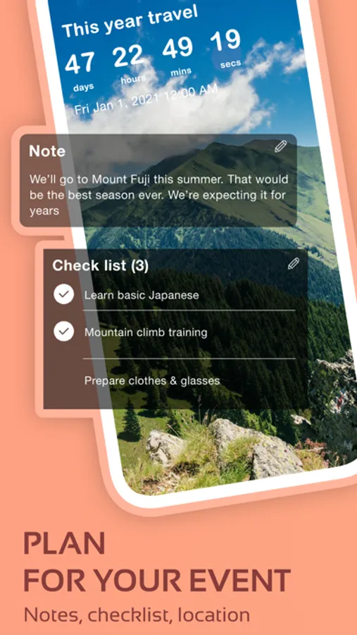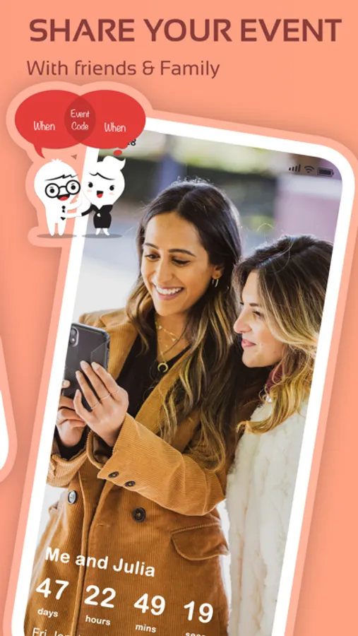 In addition, the event sharing feature will help you spread the fun when counting down with family members, friends, and colleagues. For example, husband and wife count down the date of their child's birth, parents and siblings count down Christmas day, or count down product release date with colleagues.
