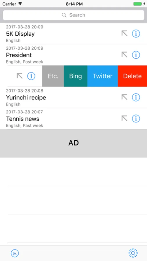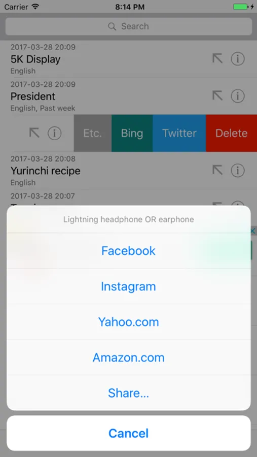 Slide a table cell of the search word, you can search Bing,Yahoo,Twitter,Facebook,Amazon and Instagram.