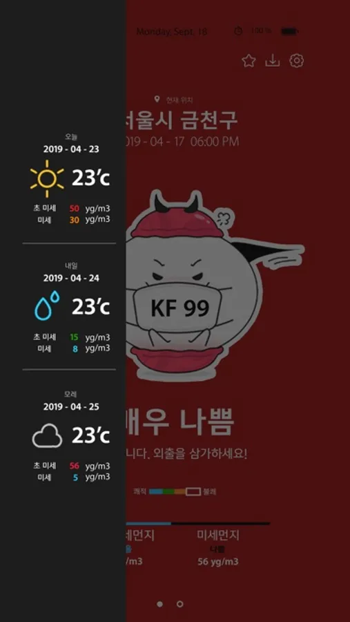 오지다씨가 오늘의 미세먼지,날씨정보뿐만 아니라 내일,모레의 정보까지 알려줍니다.