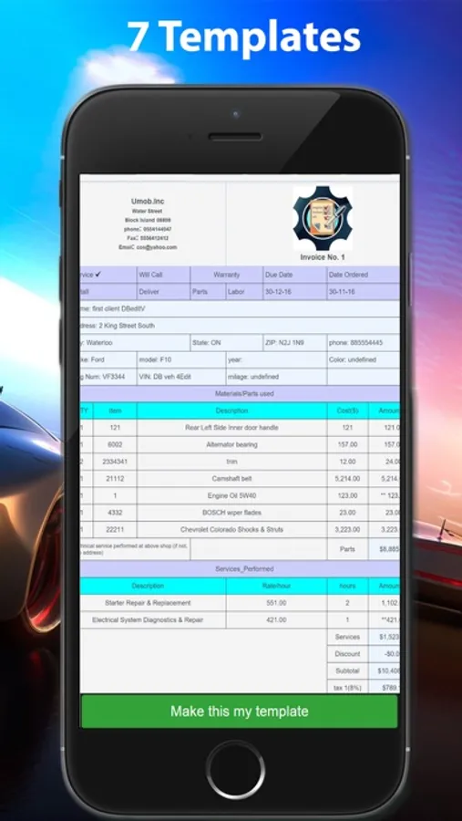 - services: keep track of all your labor items by adding descriptions and price per hour.