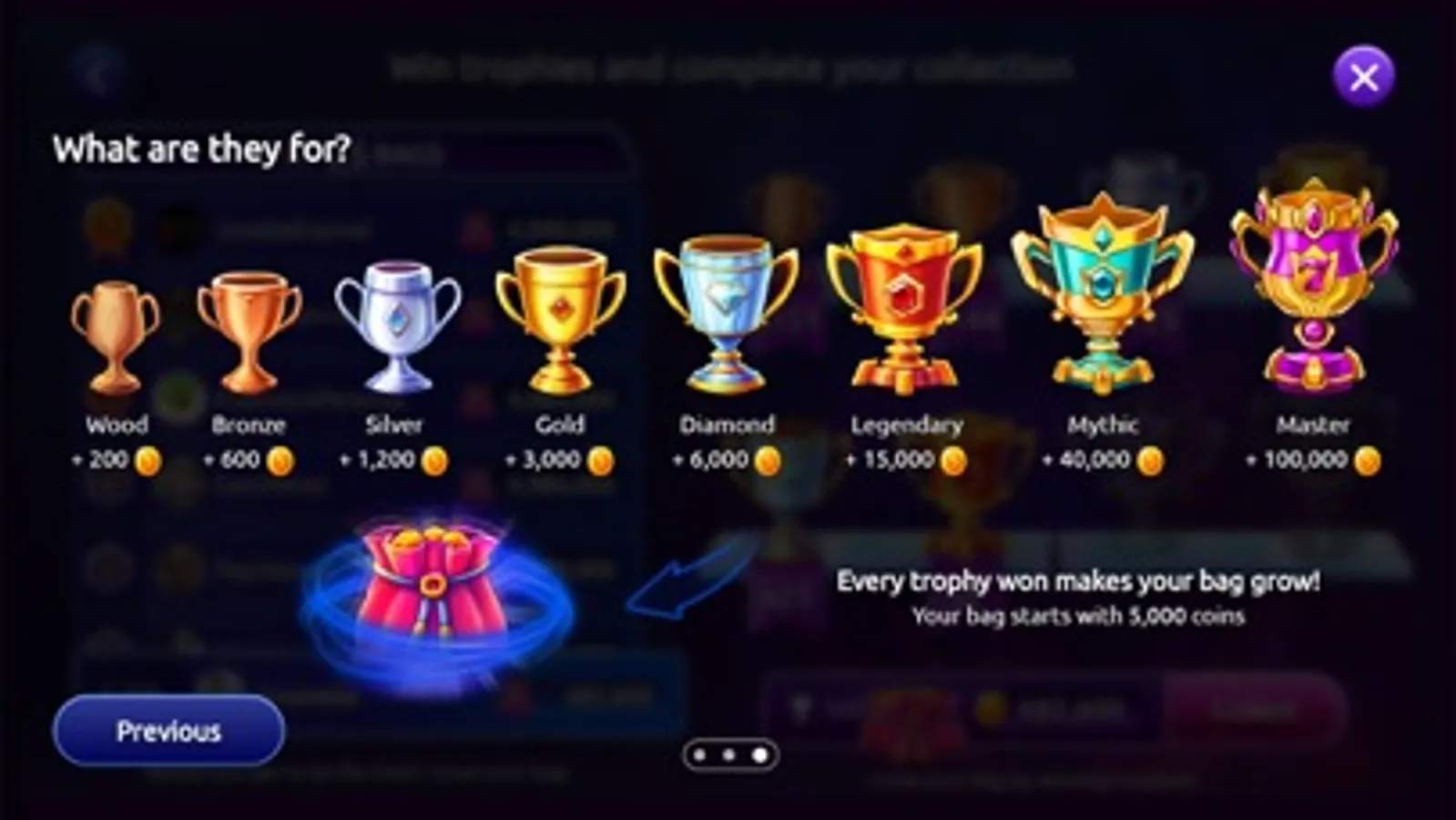 - Wood, Bronze, Silver, Gold, Diamond and Legendary trophies will help you level up and increase your coins