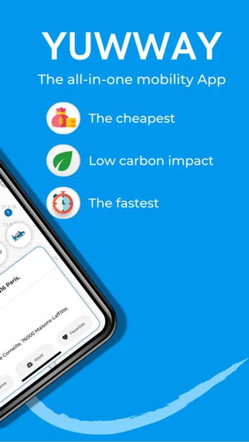 Thanks to Yuwway, get access to an enhanced mobility ! Compare and book any transportation offer directly from the application. And you'll pay the same price as on other applications offering all these services !