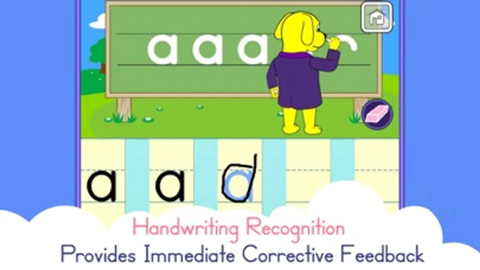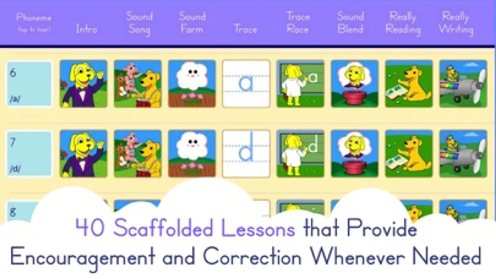 Pup’s Quest for Phonics utilizes handwriting recognition software to teach the grapheme (symbol) that corresponds to the target phoneme of the lesson. The program emphasizes correct letter formation and phoneme-grapheme connection. The child then blends the phonemes and the corresponding graphemes together to create and read words. If the child reads the word correctly, they receive positive reinforcement with an image or video of the word to support their expanding vocabulary. If the child reads the word incorrectly, s/he receives immediate corrective feedback and phoneme-blending assistance.