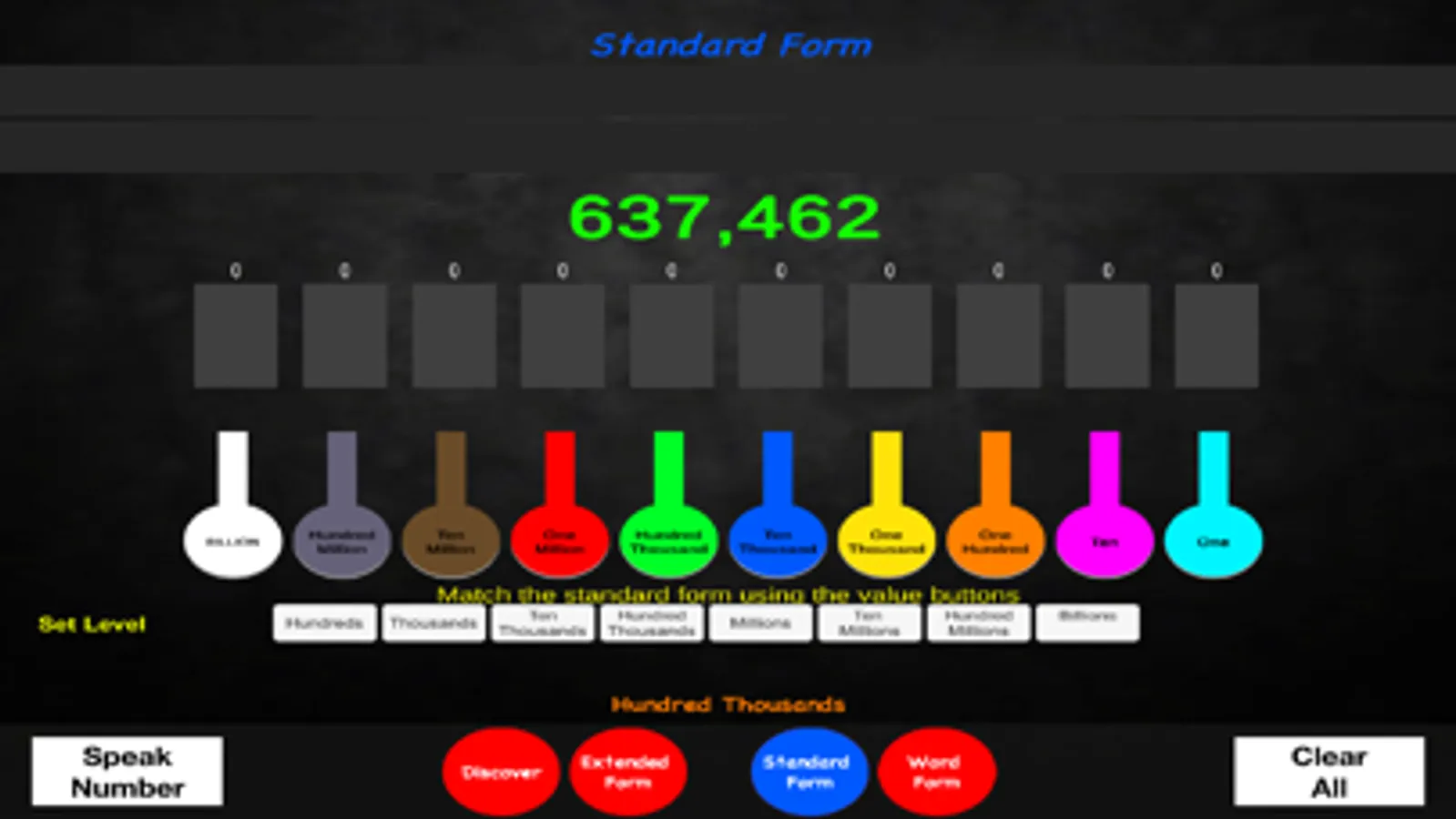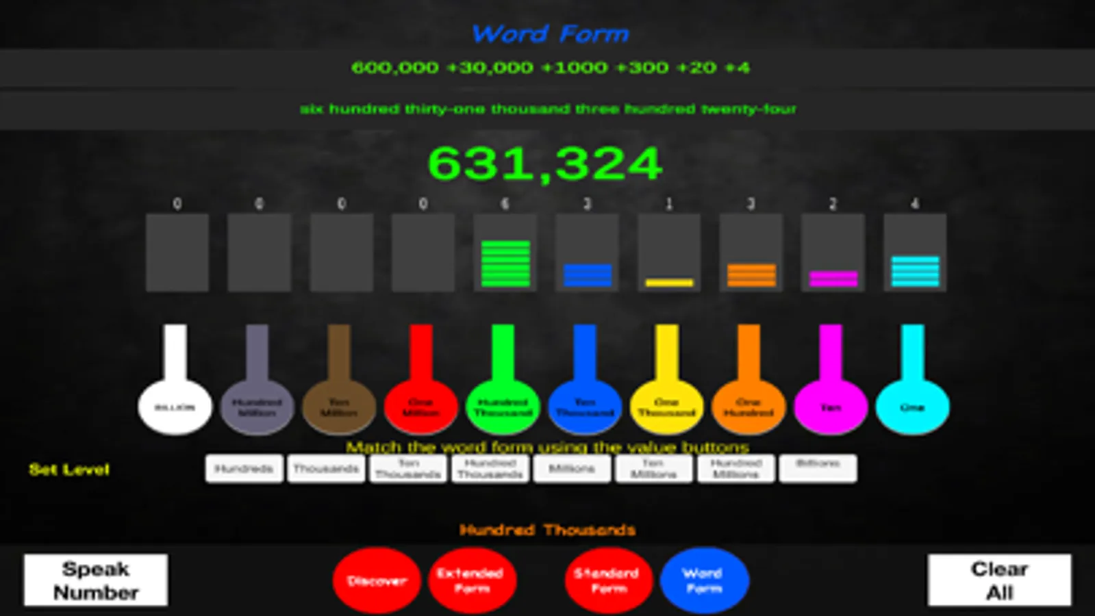 This app teaches students how to read and create numbers. It teaches number place value in 4 forms. Expanded form, Word Form, Standard Form and using graphs. https://www.youtube.com/watch?v=U3BWsT7R1lA