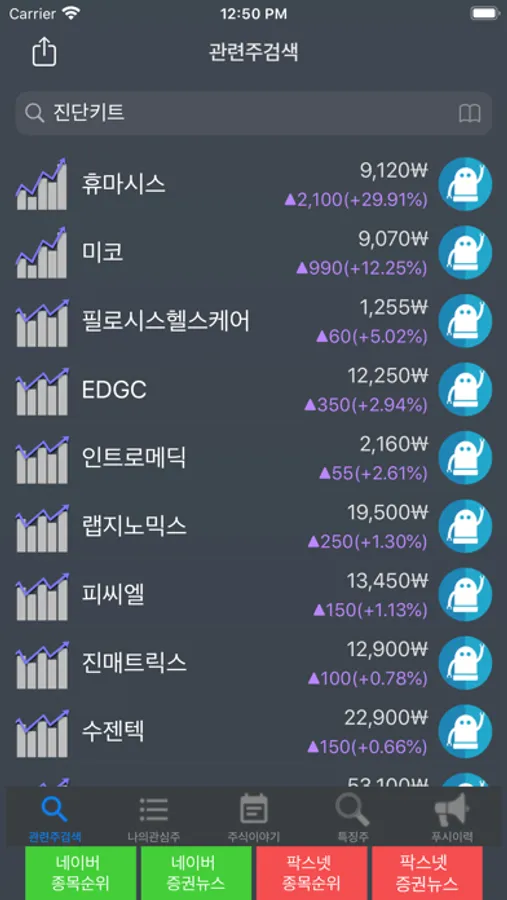 대한 관련주나 테마주 정보를 간단한 단어 검색을 통해 쉽고 빠르게 수집할 수 있도록 도움을 주는 어플로 포탈을