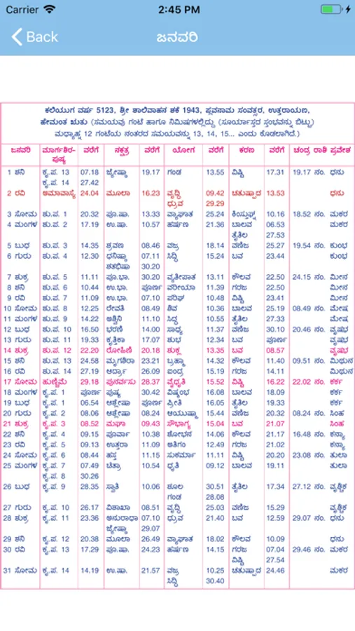 1. Detailed tithis (Indian Calendar system. Both Amavasyant and Pournimant panchang systems have been incorporated). So each date box in the calendar is accompanied with details of tithis in Kannada.