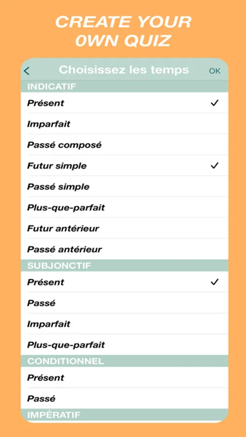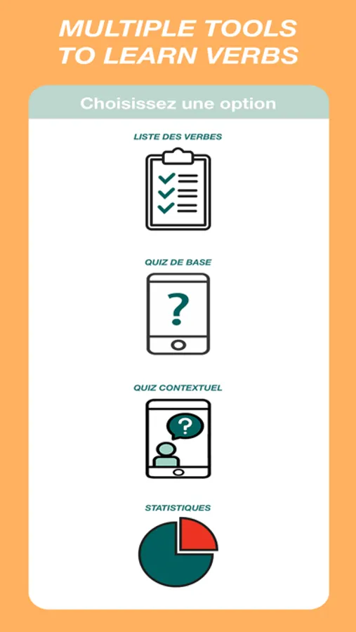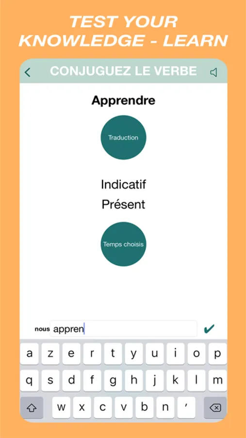 Verbs are the heart of a language and French Verbs Quiz is entirely dedicated to learning French verbs. The App is made with the most commonly used French verbs. It is simple and purposely streamlined. You have access to the verb database for consultation or study but you learn by trial and error, by quizzing yourself.