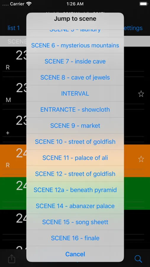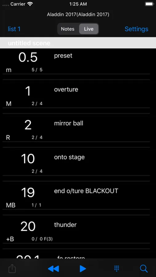 - Monitor details of all cues in any cue list, viewing labels, times and other attributes - divided by scene if required