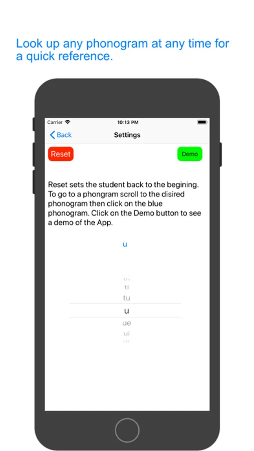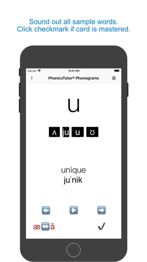 • No more lost flashcards! The app functions as a set of phonogram flashcards, including audio pronunciation and examples so students can learn even without a tutor to pronounce the phonemes i.e., distinguishing sounds sample words on each card.