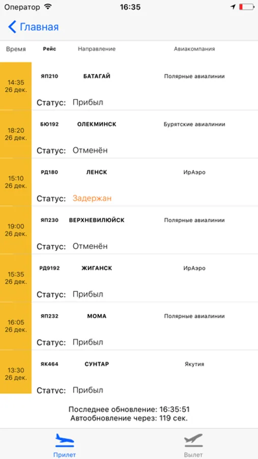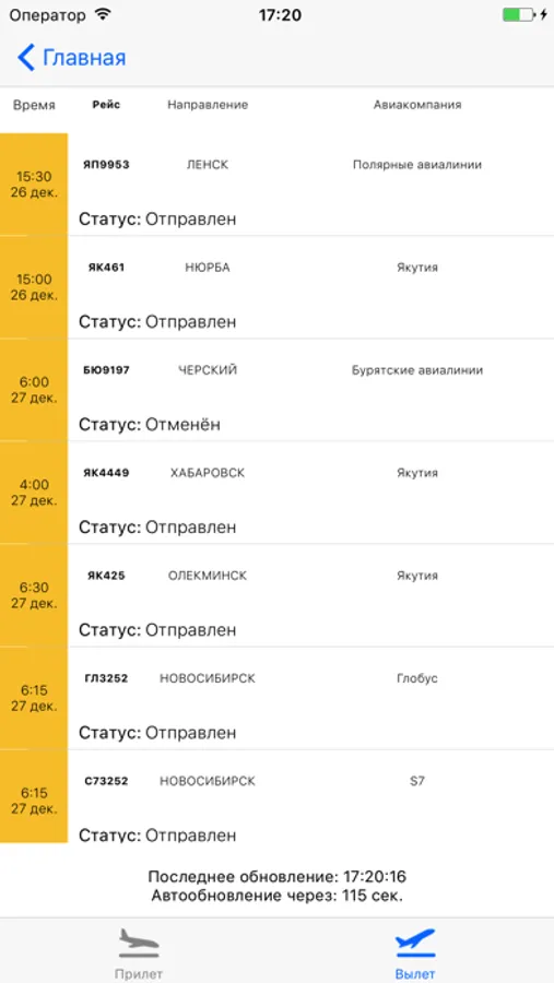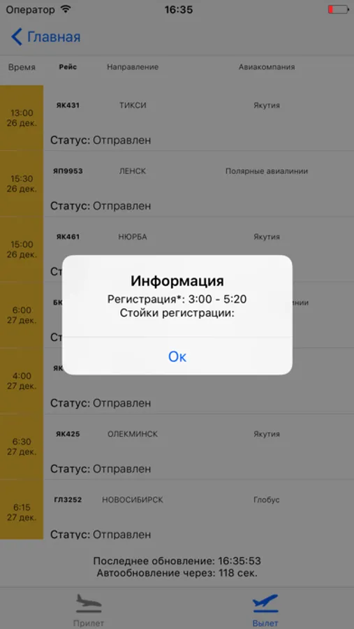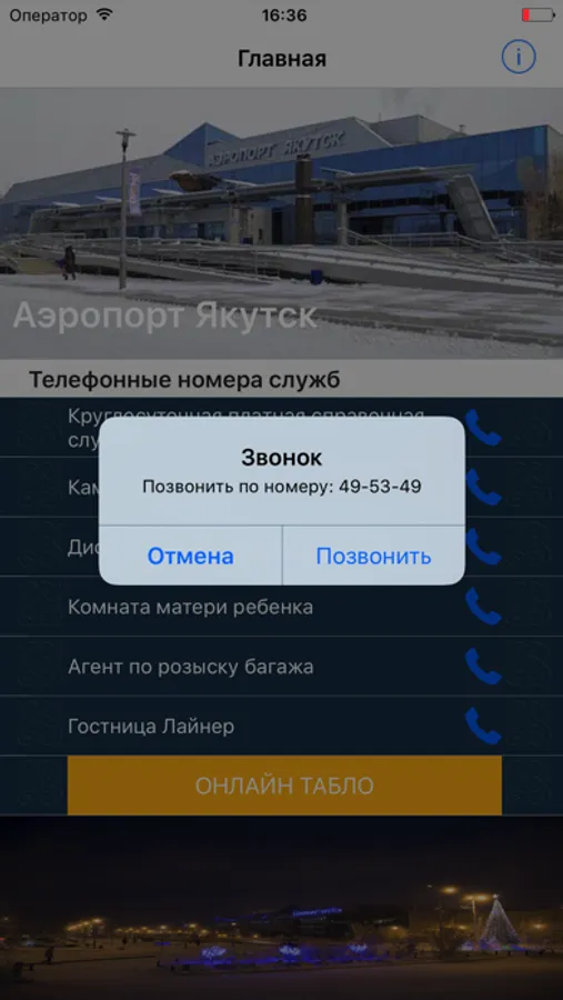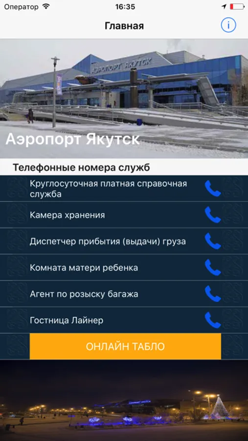Он-лайн табло прилетов/вылетов рейсов. Так же в приложении можно узнать номера служб аэропорта.
