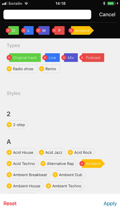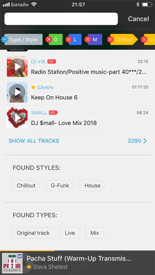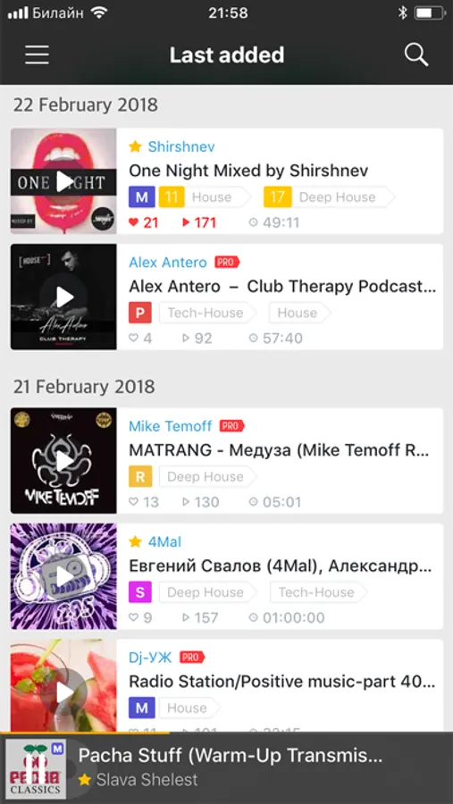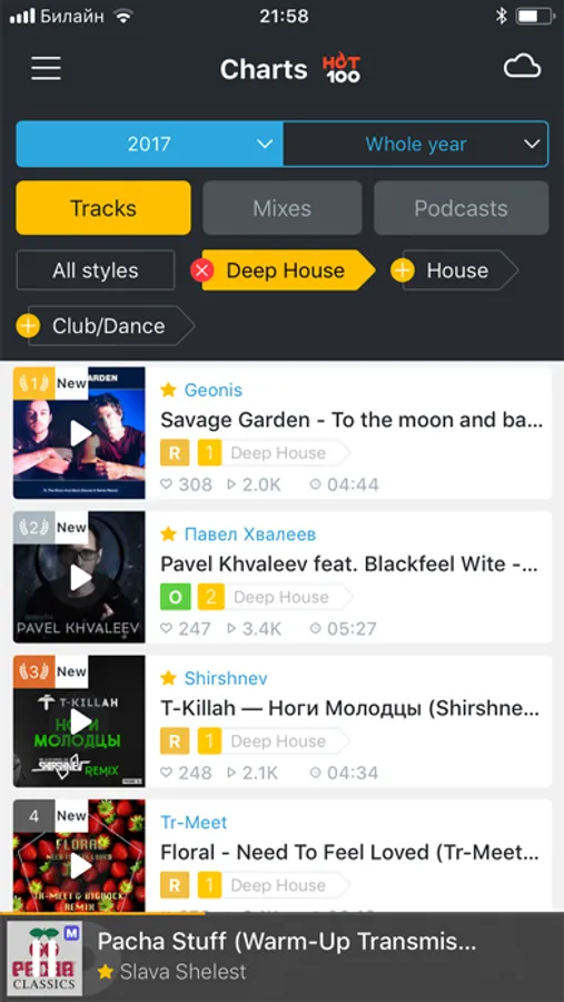 The section HOT100 Charts — the best tracks, remixes, mixes, live, podcasts and radio show with sorting according to date and musical styles