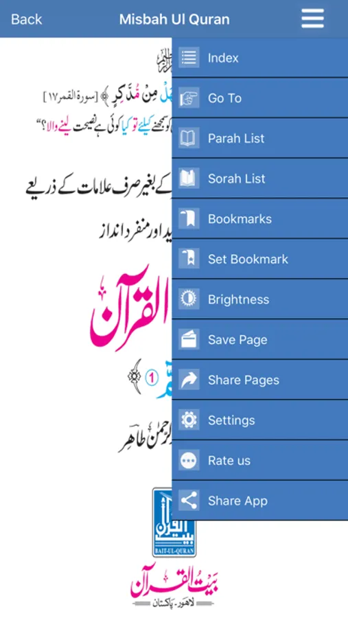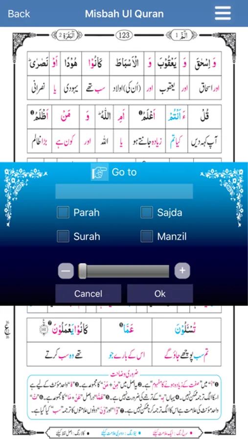 * Advanced navigation using Go to page number, Parah , Surah, Manzil and Sajda index helps to navigate easily.