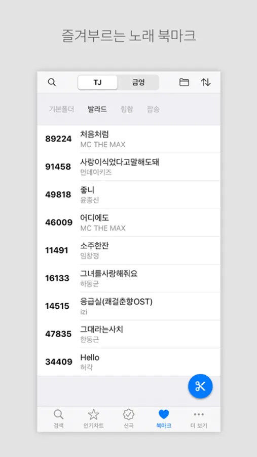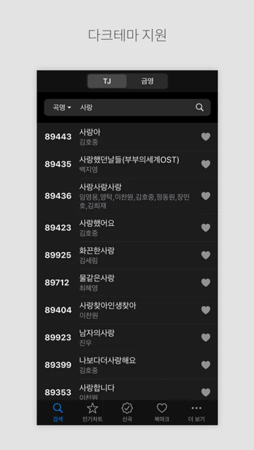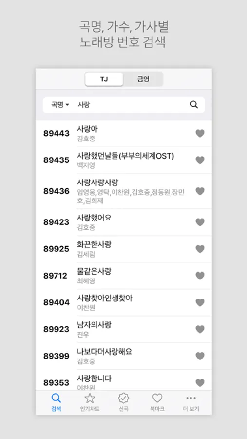 ● 제목, 가수, 번호, 가사별 TJ, 금영 노래방 번호 검색 기능 제공