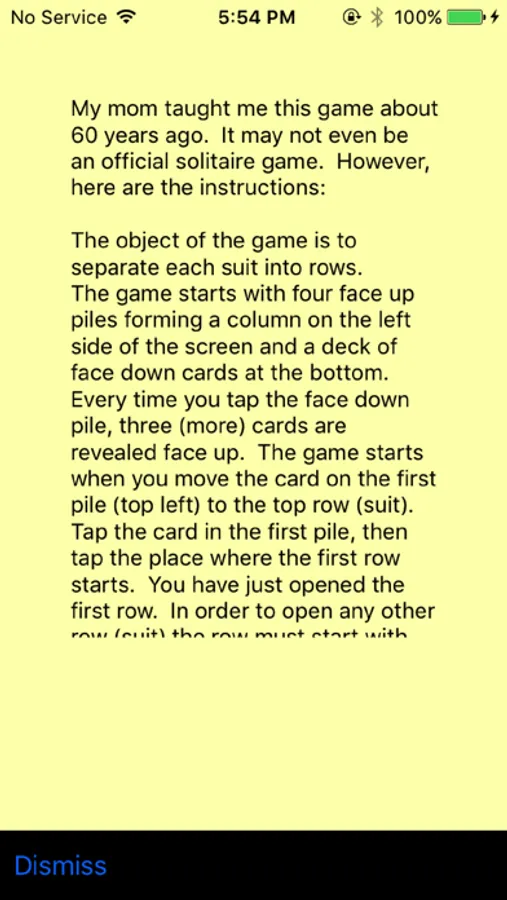 A solitaire game of unknown origin. There is an instructions screen that describes how to play. The big deal is there is a cheat button so there is never any reason to lose :-). I learned this game when I was just beyond a toddler from my mother and have played it ever since.