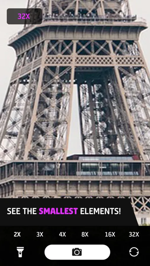 Super Zoom Telephoto Camera Pro could transform your iPhone or iPad into a full screen zoom camera with flashlight! You can choose between 6 auto-zoom scales(2x, 3x, 4x, 8x, 16x, 32x) and pinch to zoom in/out manually from 1x to 32x.
