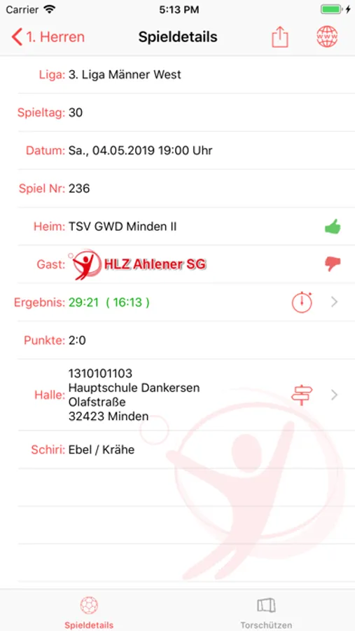 - Details zu einem Spiel (z.B. Datum, Uhrzeit, Halbzeitergebnis, Schiedsrichteransetzung, Hallenanschrift etc.)