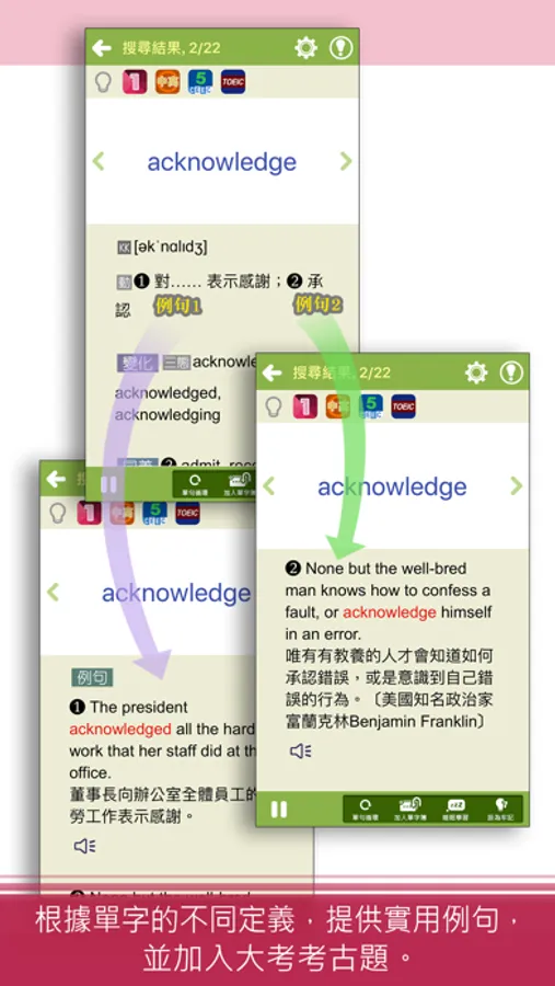 (3) 考古題:加入大考考古題曾出現的例句,並在句末標明考試年分與名稱。