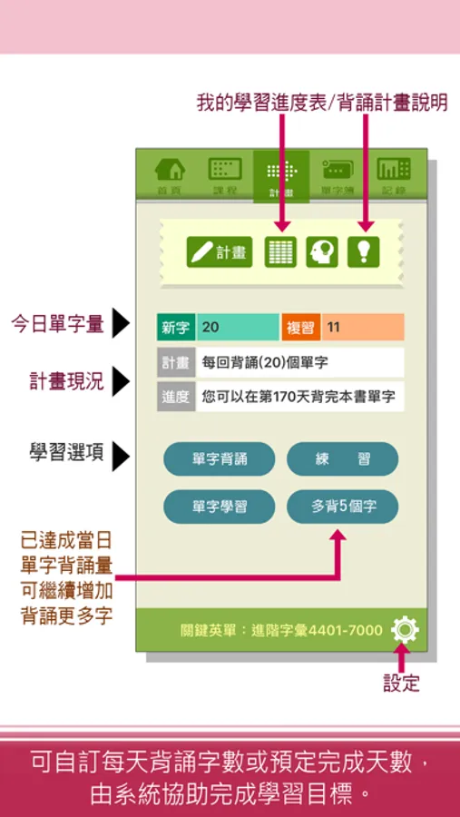 4. 自訂學習進度:可依每天背誦字數或預定完成天數擬定計畫,系統將自動換算可完成的天數或每天需背誦的單字數,協助您完成學習目標。