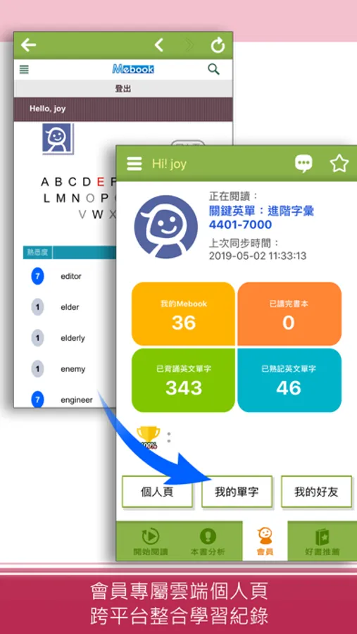 10. 雲端服務:登入會員後,可同步學習記錄保存在我們雲端服務器,無論從網站和手持裝置都能查看您的學習記錄與單字量。