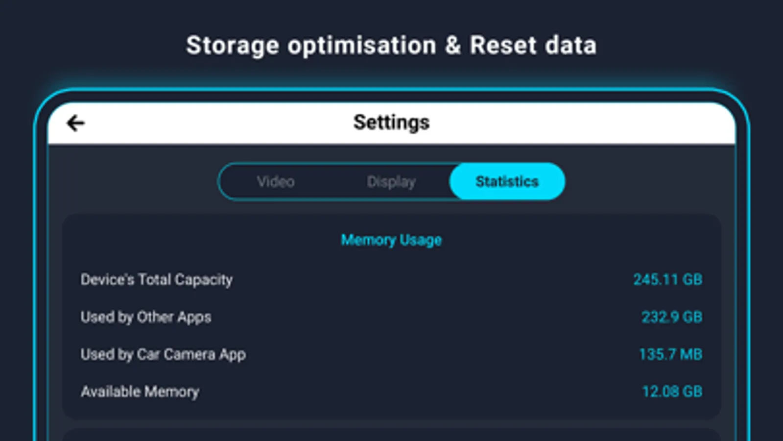 - Show memory usage by the device, by the Car Camera app and also provide available memory space in the device.