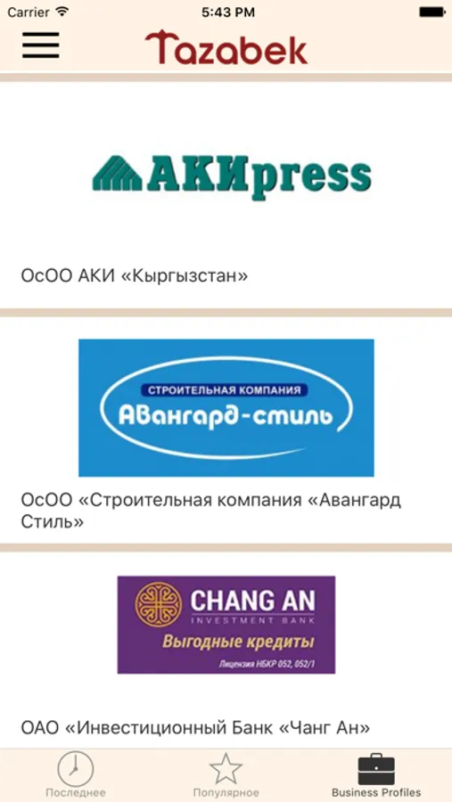 - Tazabek Business Profiles — деловой клуб, объединяющий компании Кыргызстана;