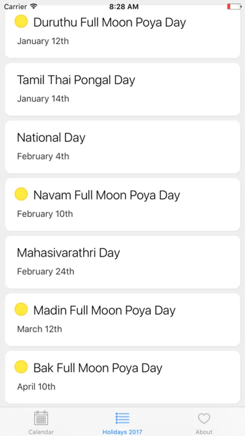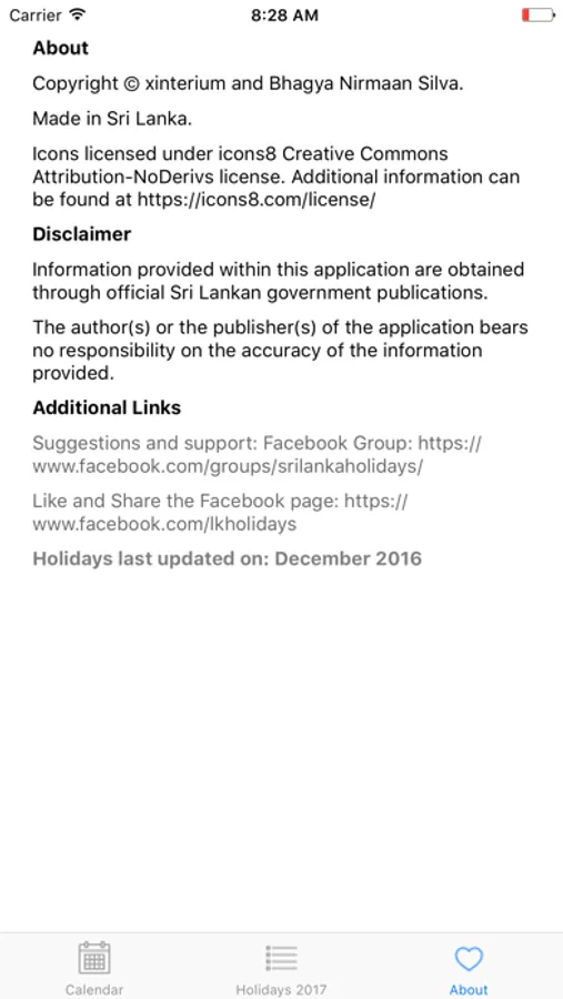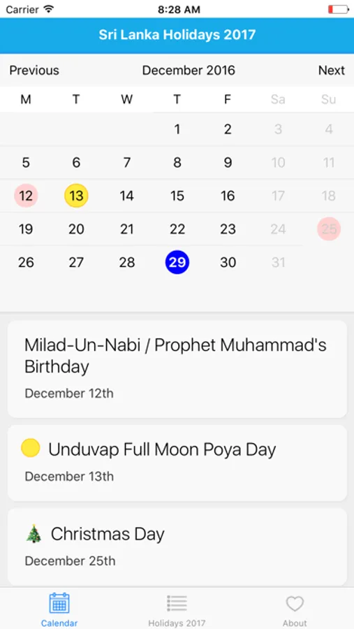 Sri Lanka Holidays app makes it easy for you to quickly look through the public and bank holidays as published by the Sri Lankan government.