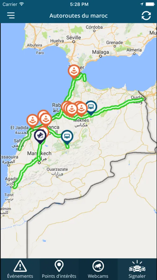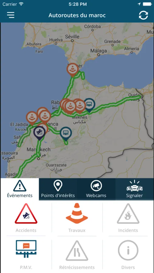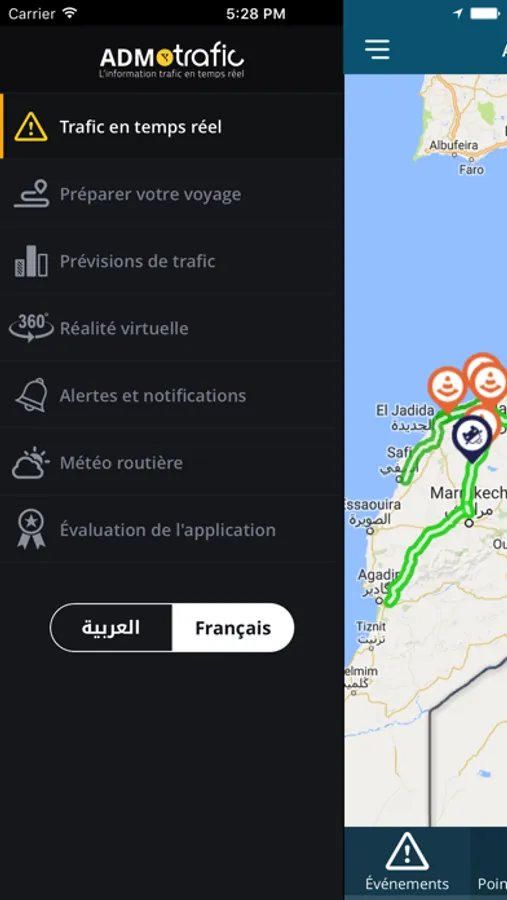 L'application mobile ADM Trafic présente un réel outil de visualisation géographique du trafic en temps réel, permettant de suivre tous les événements survenants sur le réseau autoroutier (Incidents, accidents, travaux…).