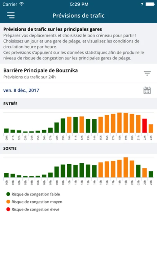 Prévisions du trafic sur les principales gares : Un nouvel outil permettant de préparer les déplacement en choisissant le bon créneau pour partir. L’utilisateur peut choisir un jour et une gare de péage, afin de visualiser les conditions de circulation heure par heure. Ces prévisions s'appuient sur les données statistiques afin de produire le niveau de risque de congestion sur les principales gares de péage.