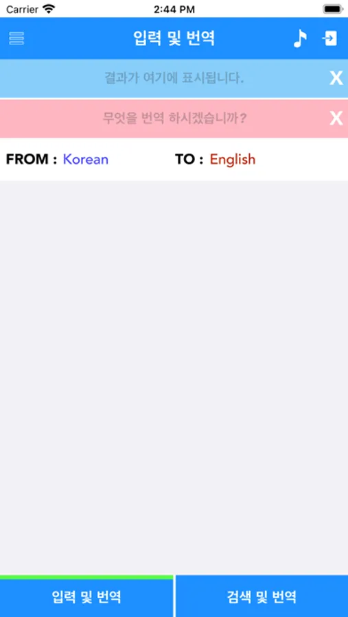 Look up default English to Korean or Korean to English sentences and phrases or manually type your own English to Korean or Korean to English words and sentences with a few clicks.