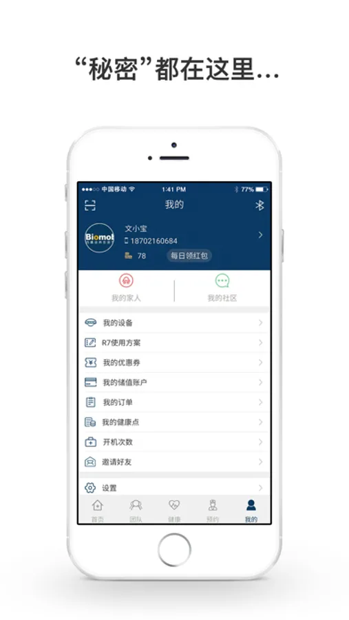 专注于慢性病的疗效管理,通过手机蓝牙与百慕迪“生物电”技术移动治疗终端R7相连接,有效提高用户的依从性,并为用户提供便捷的疗效管理服务。