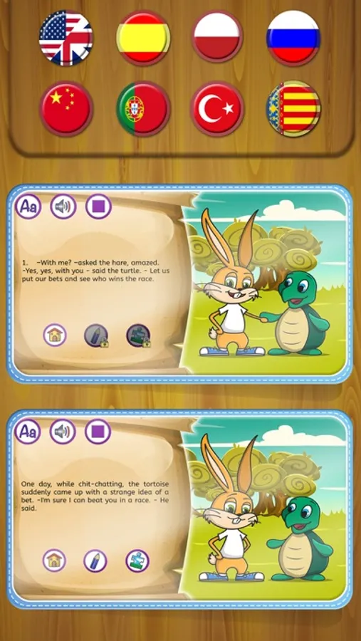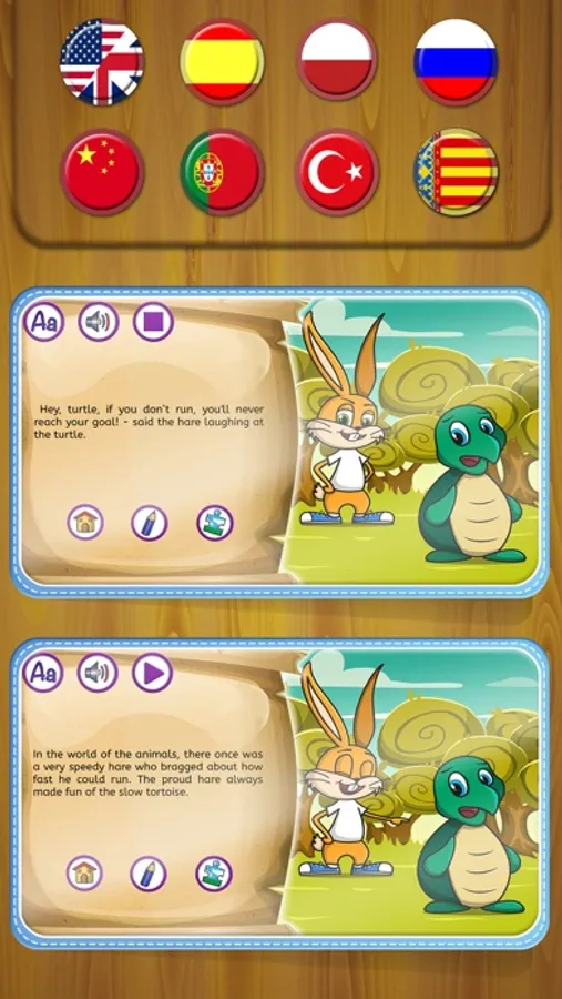 • The story: Read and listen to the story by pressing the audio button to play the sound. The audio is available in English, Spanish, Chinese, Polish, Portuguese, Russian, Valencian and Turkish, accompanied by beautiful background music and sound effects.