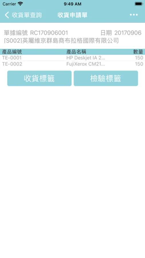 收貨查詢:查詢已完成確認收貨資料並可列印相關標籤。