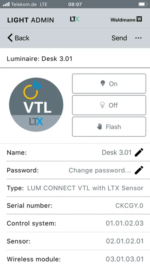 The LTX sensor unit can be parameterized with the LIGHT ADMIN app. The LEDs in the sensor unit can be activated or deactivated via the LIGHT ADMIN. If the luminaires are connected to the LTX Cloud, the app enables the configuration of the building structure and data communication with the LTX Cloud.