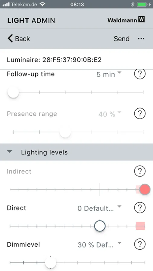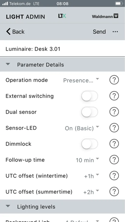The LIGHT ADMIN app allows a simple parameterization of luminaires equipped with the TALK module. For example, many functions and parameters of a free-standing luminaire, from dimming value to presence control, can be easily configured.