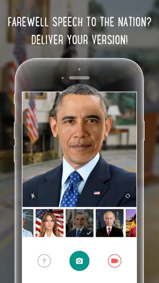You think politicians play with you? Now play with politicians! Put on masks of Donald Trump, Barack Obama, Melania Trump, Vladimir Putin, Angela Merkel and record your official message to the Nation.