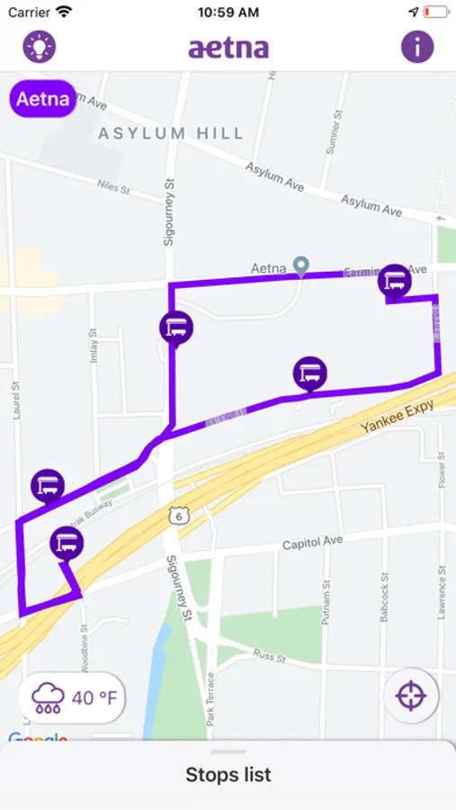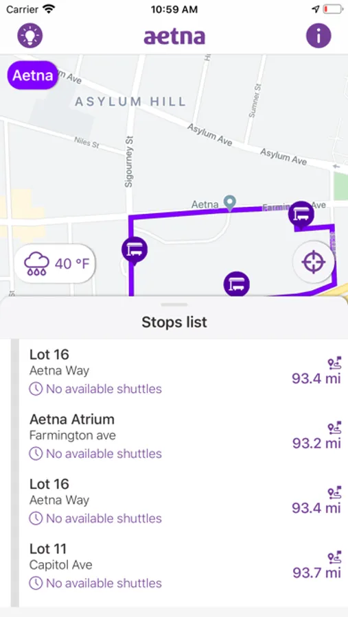 This mobile app provides a seamless and smooth bus ride to track the shuttle of Aetna parking lot. Monday - Friday from 6am -8pm allowing our riders to stay safely inside the buildings or in your vehicle during inclement weather or at night.