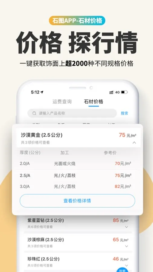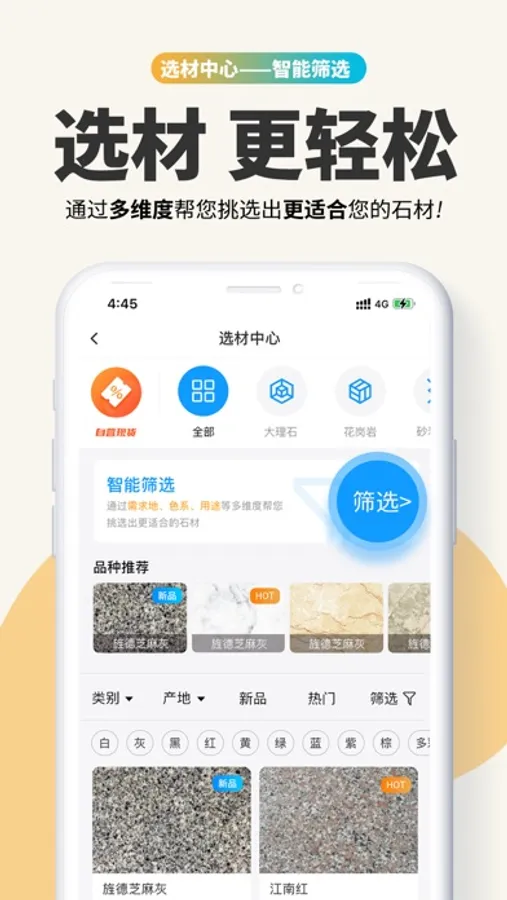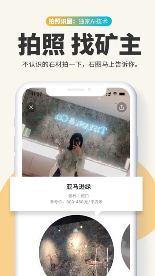 基于AI +大数据+移动互联网技术,我们为工程采购商带来高效便捷的石材品种识别体验,注意识别石材品种,识别精确度同时罗列相似产品,推荐就近的供应商。