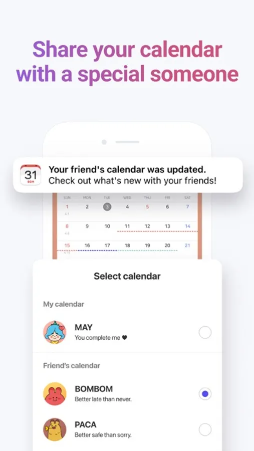 Use your email, Google, Facebook or Apple accounts for an easy, fast sign-up process. We keep your user data safe on our secure server with an auto-backup/restore function even if you change your phone or reinstall our app. - Share Your Calendar with a Special Someone