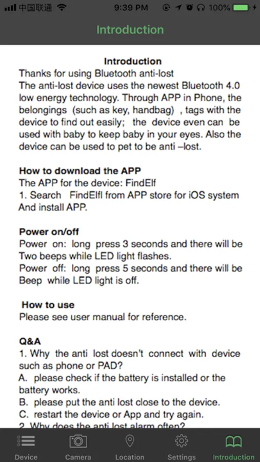 该APP目前只支持兰牙4.0设备,在同一时刻只能对一个防丢器进行双向管理,用户手机为iphone4s以上