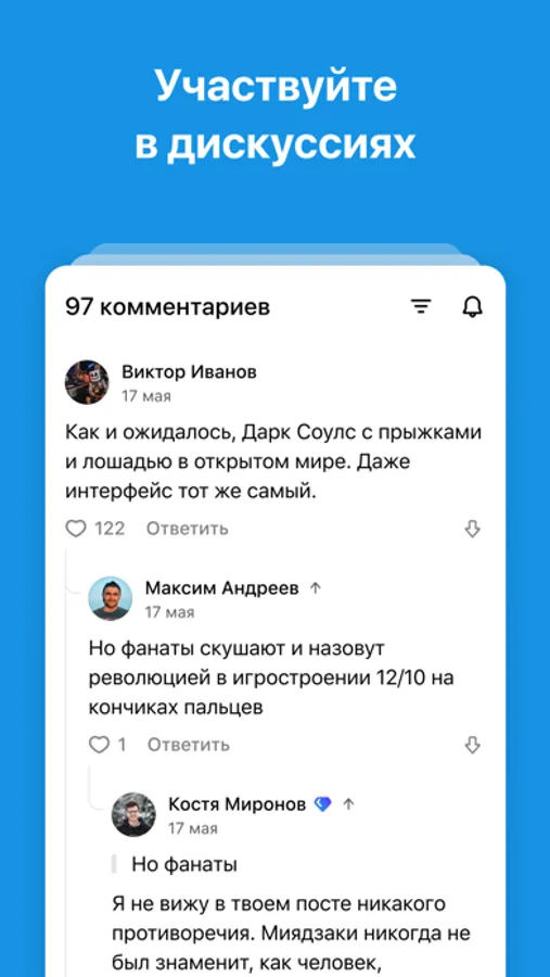 • Участвуйте в развернутых дискуссиях благодаря нашей системе веток дискуссий.